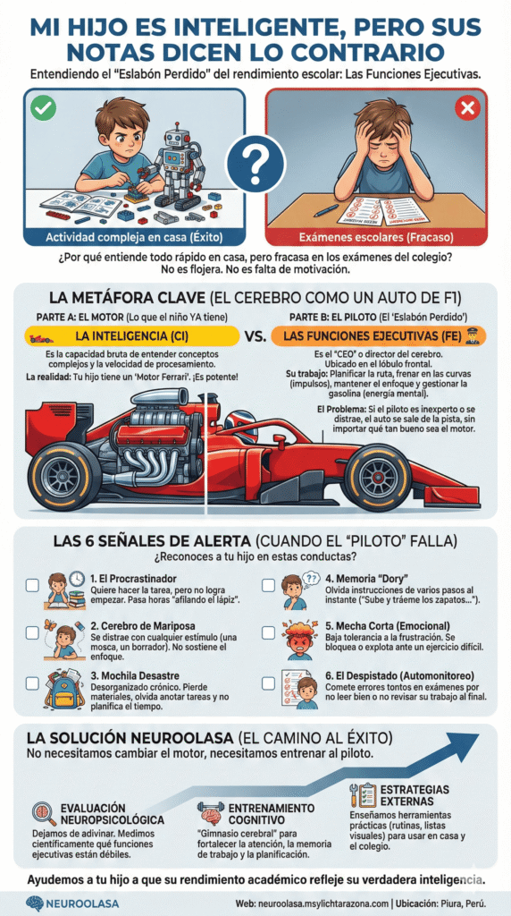 Si tu hijo tiene un «motor Ferrari» pero el piloto (su sistema de gestión cerebral) es inexperto o se distrae mirando el paisaje, el auto se saldrá de la pista constantemente, por muy potente que sea el motor.